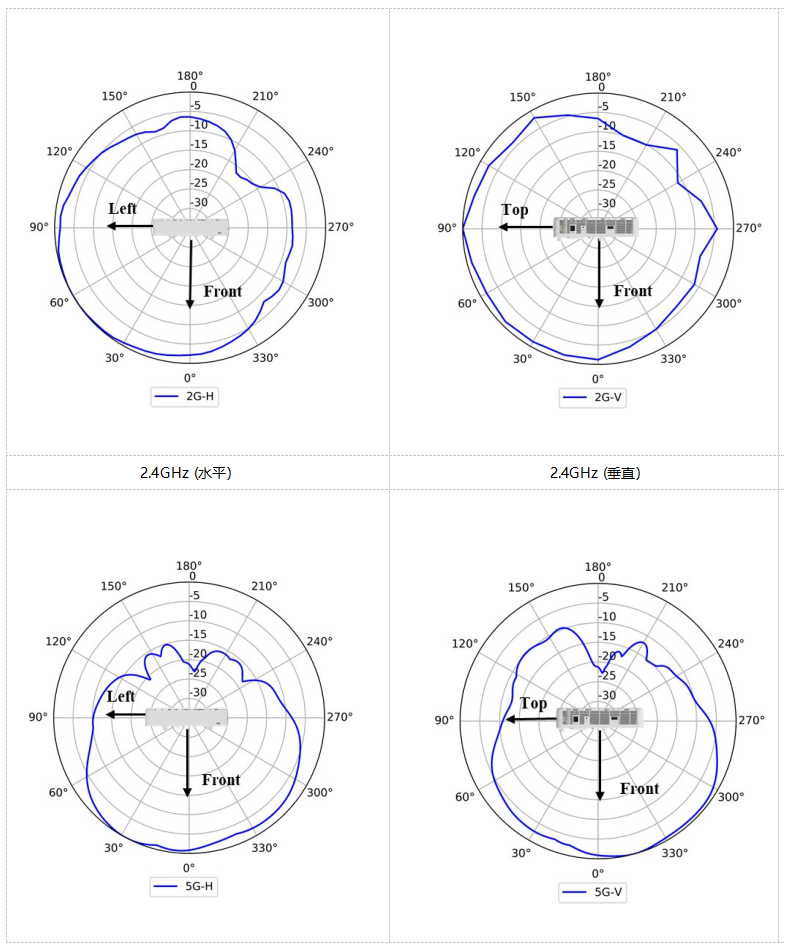 说明 1、上述增益为单天线峰值增益 2、组合 2.4GHz或 5GHz 所有天线后,等效天线增益:2.4GHz:2dBi,5GHz:3dBi |
