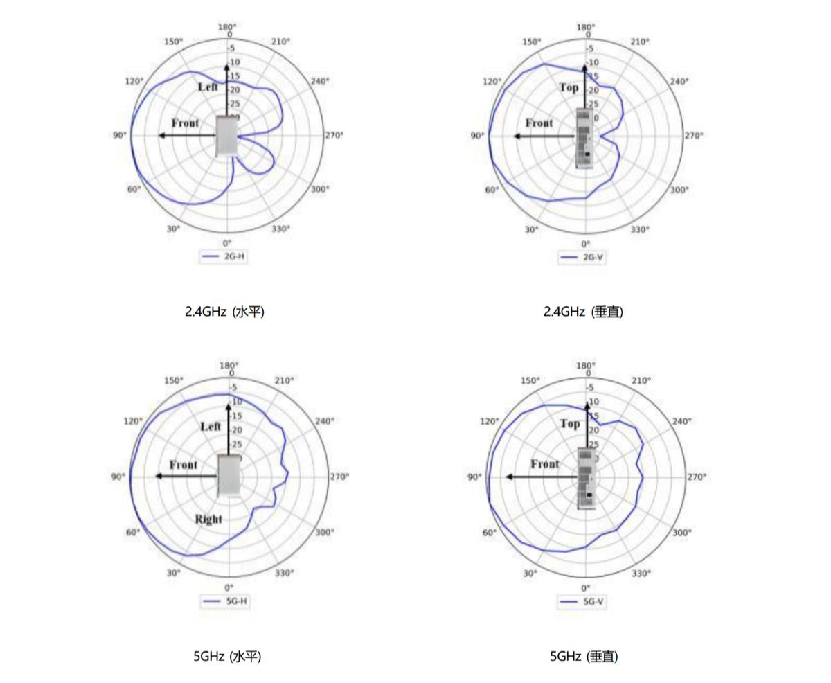 说明 1、上述增益为单天线峰值增益。 2、组合2.4GHz 或 5GHz 所有天线后,等效天线增益 :2.4GHz: 2dBi, 5GHz:3dBi。 |